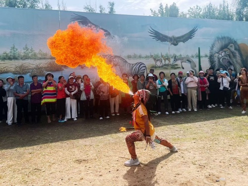 清晨的阳光刚漫过农场围栏,入口处便排起长队,扫码、检票的队伍有序延伸。孩子们攥着家长的手蹦蹦跳跳,眼底满是期待,恨不能立刻闯进这片田园天地。沿景区步道往里走,每处生态景致前都围满驻足观赏的游客:有人举着手机定格垂挂的蛇豆,小朋友踮着脚给小兔子喂胡萝卜,连空气里都飘着节日特有的热闹气息。园区重头戏 “野人喷火” 表演尚未开场,场地已被游客层层围住,大家踮脚探头紧盯舞台。身着粗犷服饰的表演者登场后,现场瞬间安静;随即烈焰从其口中喷涌,在阳光下划出炽热弧线,人群爆发出阵阵惊呼与掌声,每一次喷火都将气氛推向高潮。喷火表演的热度尚未完全消散,欢快的音乐已悄然响起,一场 “众人跳舞” 的狂欢随即拉开序幕。工作人员率先起舞,游客受热情感染自发加入,分散人群渐围成热闹大圈。陌生的面孔因同步的舞步相视一笑眼中满溢着纯粹的快乐。笑声、脚步声与音乐声交织缠绕,在农场上空汇成一片欢乐的海洋。另一边,轨道小火车站点前也排起长龙。色彩鲜亮的小火车刚稳稳到站,等候的游客便有序上车。随着一声清脆的 “呜 ——” 鸣笛,小火车载着满车欢声笑语缓缓驶离。游客们一边欣赏沿途错落的生态风光,一边用手机定格悠闲瞬间,小火车 “咔嚓咔嚓” 的行进声伴着欢笑声,成了田园里最动听的专属旋律。