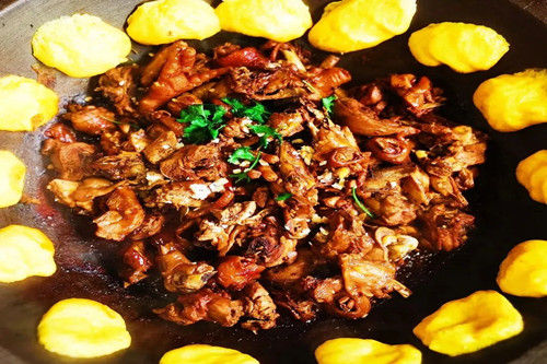 热乎炕,砖瓦墙,大铁锅里的菜气香。东北大铁锅被称为万物皆可炖,真材实料全在锅里,木柴燃烧时,发出噼啪的声响,柴火产生的天然焦香,顺着铁锅渗进肉里,浓郁酱汁咕噜冒着泡,肉质醇香四溢,土豆软糯入味,粉条晶莹顺滑,浸满汤汁的贴饼子,无不诉说着冬天的味道。邀三五好友围锅而坐,畅谈人生,把酒言欢,吃在小馆,却是家的味道,这样的一餐铁锅炖,也算是自得真味了。