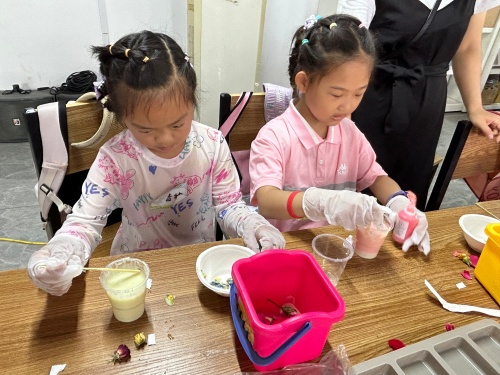 孩子们早已迫不及待,纷纷动手操作起来。有的孩子专注地切着皂基,眼睛紧紧盯着手中的刀具,小心翼翼地,生怕切得不均匀;有的孩子则小心翼翼地往融化的皂基里滴加玫瑰精油,那专注的神情,仿佛在完成一件神圣的使命;还有的孩子精心挑选着玫瑰花瓣,将它们一片片整齐地摆放在模具中,如同在创作一件独一无二的艺术品。在制作过程中,孩子们互相交流、互相帮助,遇到问题时,便向老师和工作人员虚心请教,现场一片热闹而温馨的景象。经过一段时间的耐心等待,一块块精美的玫瑰花精油皂终于诞生了。每一块都散发着淡淡的玫瑰清香,宛如一件件精美的工艺品,让人爱不释手。孩子们捧着自己亲手制作的精油皂,兴奋得手舞足蹈,纷纷展示给小伙伴和老师看。有的孩子兴奋地说:“这下我更喜欢洗手啦,一想到可以用自己亲手制作的玫瑰花精油皂洗手,就开心得不得了!”