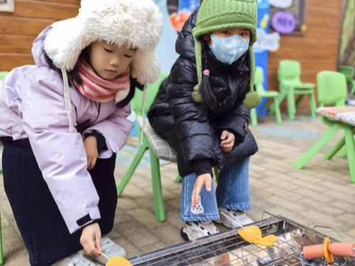 远望操场上围着人群,老师们身穿花袄,跳起热闹的舞蹈,将“东北风”的美与热情一一展现,孩子们争先围观,给老师们呐喊,为老师们鼓掌。在这样欢乐祥和的气氛里,烧烤派对正式拉开帷幕。接下来孩子们变成“小小美食家”,走进教室一看,孩子们都在兴致勃勃地挑选自己喜欢的菜品,脆弹的大虾、软糯的豆皮、清甜的白菜、油润的香肠,将美味串一串,摆起来,准备好视觉与味觉共享的开场。而此时操场上的炉火早已点好,细碎的火星期待着与肉串的相遇,迸发出热烈的醇香。待到孩子们正式落座,最令人期待的时刻开始了,小朋友们担任“烧烤大师傅”,专心致志地烤起肉串,感受专属于“东北娃”冬日的快乐。撒点盐,翻个面,美味即将呈现,“大厨”忙里忙外,小食客们也没得闲。随着烤串上桌,孩子们的小手没停下过,嘴巴也不曾空闲,鲜香的羊肉,甜糯的玉米,统统装进肚子里,化作一段美味的回忆,保留在孩子们的心中。吃得饱饱,烦恼少少,小朋友们拍着圆滚滚的小肚皮,还不忘清理好“战场”,打扫好桌面以后才离开“烤场”后才回到教室里跟大家分享今天的美妙回忆。