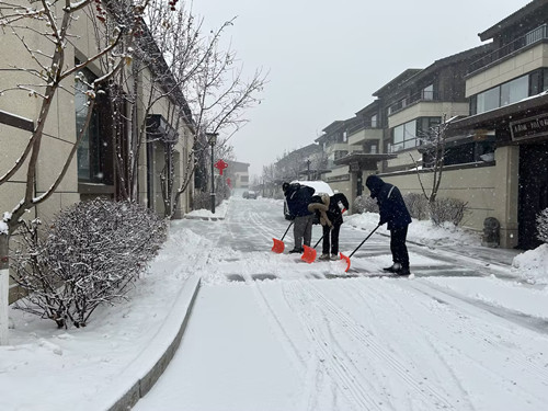 北风呼啸,雪花飘洒。恶劣的天气把大家的手和脸冻得通红,但这并没有影响他们保障业主出行安全的真心与热情。大家发扬吃苦耐劳、顽强拼搏的工作精神,在严寒风雪中挥舞着铁锹、扫帚、雪铲,一点一点清除积雪,铲掉薄冰。雪一直下,他们耐心、反复地清扫着不断被雪覆盖的道路。全体首嘉物业人团结协作,全力清理园区、道路上的积雪,为业主开辟了一条干净、安全而又洋溢着温情的畅通出行之路。
