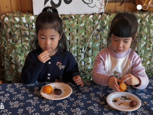 炉火的温暖,继续烘烤着来自大地的礼物——花生、红枣、沙糖桔、板栗在铁丝网上渐渐变得温软、香甜。孩子们参与其中,笨拙又认真地翻动着食物,观察着颜色与气味的微妙变化。当板栗绽开笑脸,红枣溢出蜜意,沙糖桔的汁水在口中爆开,他们品尝到的不仅是食物本真的甜美,更是自己动手、与伙伴分享的满足。这堂课没有复杂的理论,却在最朴素的“吃”这件事上,教会孩子们珍惜自然的赠与,理解“一分耕耘,一分收获”的简单道理。这里围坐的不只是一方暖炉,更是情感流动的磁场。老师们不再是单向的知识传授者,而是与孩子共同探索、共享温暖的陪伴者。孩子们在安全与爱的氛围中,自由地观察、提问、尝试、分享。他们学习等待食物成熟,学习将第一杯暖茶递给老师,学习把最甜的橘子分给伙伴。这份“围坐”,凝聚了成长的欢喜、家园的信任与师幼间双向奔赴的美好。